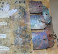 I was doing with this page I had made a lot of 'pockets' for tags to one side. I have made six tags coloured up with inks, micas and stains and decorated with a bit of stamping. Lyrics from some other songs I like are on the back and although there is room for a bit more decoration I think I will leave it there for now - there are another 18 pages to go after all!! Because the altered book is a WIP I decided not to add fibres to the tags yet as goodness knows what kind of state I would get in but I will add some later - I hope it will look quite funky spilling out of the book.