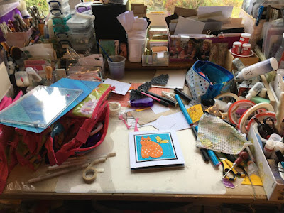 Centre stage is my pop up card using some gorgeous Laurel Burch stamps. Totally inspired (enabled) by the lovely Neet as I had never really registered these images before. Thanks Neet!! Otherwise just a complete mess. In the interest of full disclosure, here is the view from the doorway:-