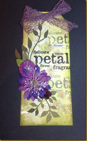 The challenge is ‘the letter ‘F’ and the colour Green, and you MUST use 1 real stamp’. This is a taq challenge so I started off with one of the gorgeous Julie Nutting tags that are designed to be used with her doll stamps (Now I wonder why I bought these……?). The ‘F’ was a no brainer really – it had to be a flower tag.
